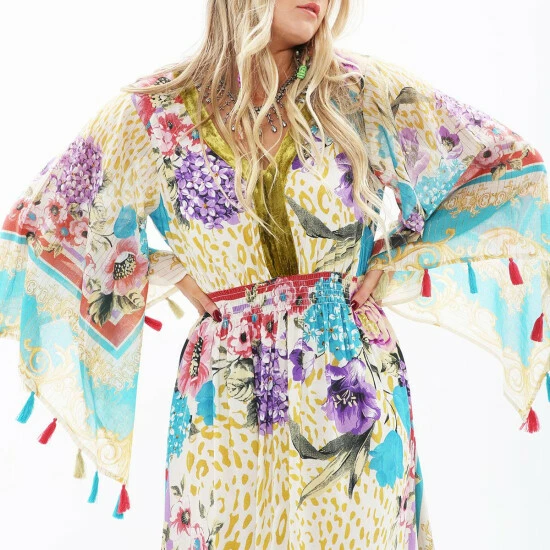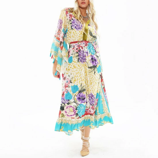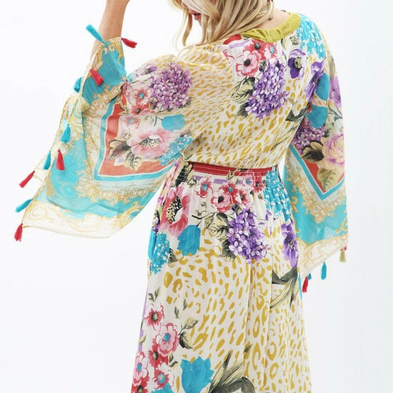 Feel and look your best in this Artisan leopard scarf floral print v-neck dress with a ruffled velvet neck band and flare sleeves.