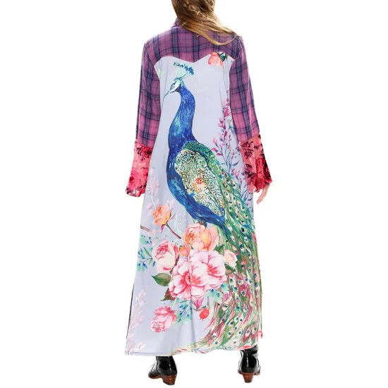 This duster features a lovely peacock design on the back for a unique style that will truly wow.