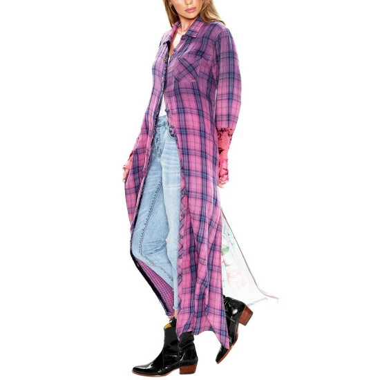 - Washed plaid design, peacock floral print on back, burnout velvet sleeves, button down closure, front and side pockets, crystal buttons
