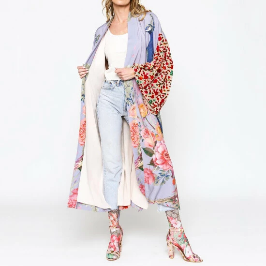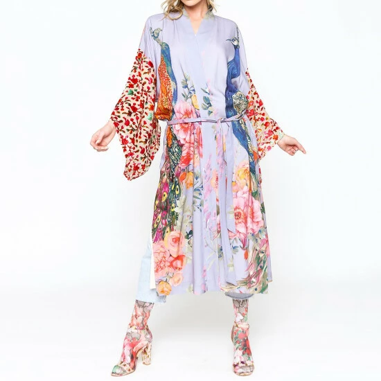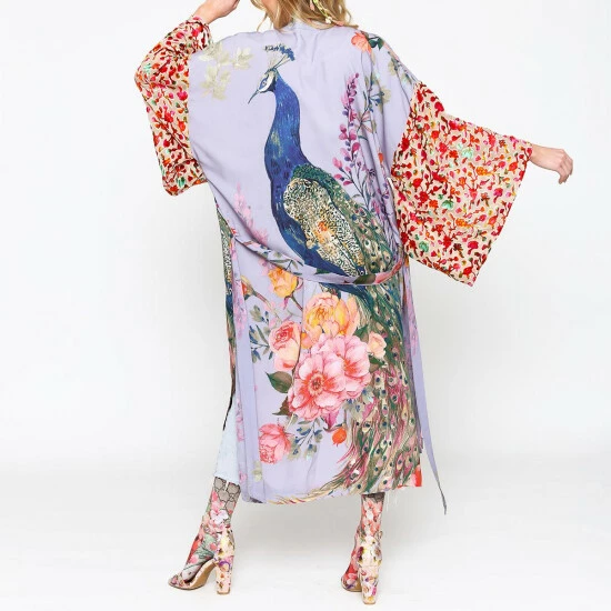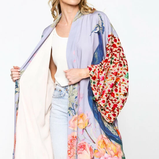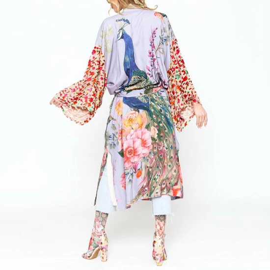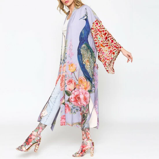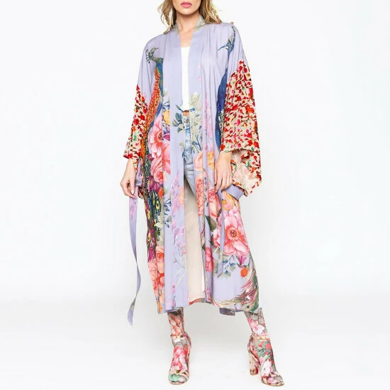 Slip into a world of floral peacock delight in this stunning blue peacock print topper. It features a coordinating belt, velvet burnout sleeves and side slits.