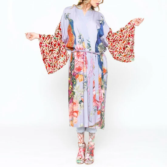 Slip into a world of floral peacock delight in this stunning blue peacock print topper. It features a coordinating belt, velvet burnout sleeves and side slits.