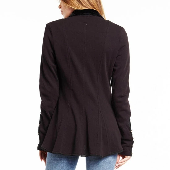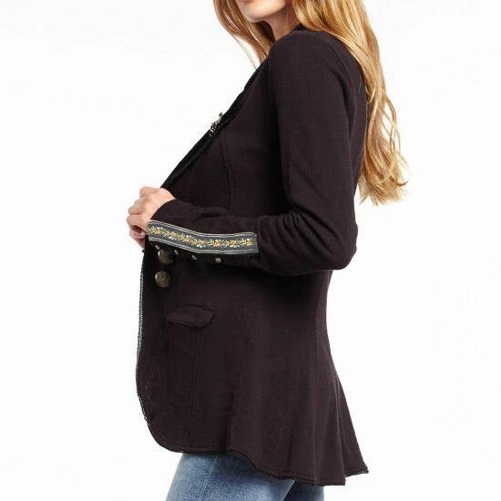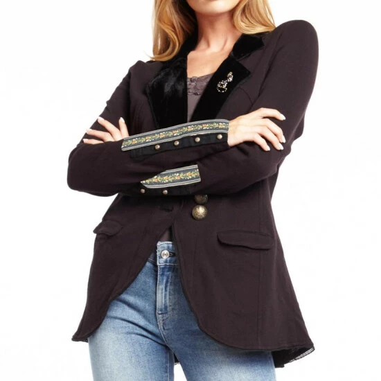 - French terry blazer with trims attached on sleeve cuffs and pin attached on velvet lapel