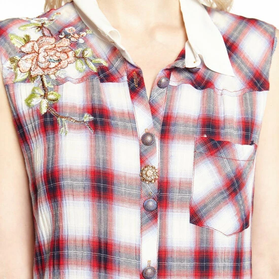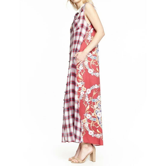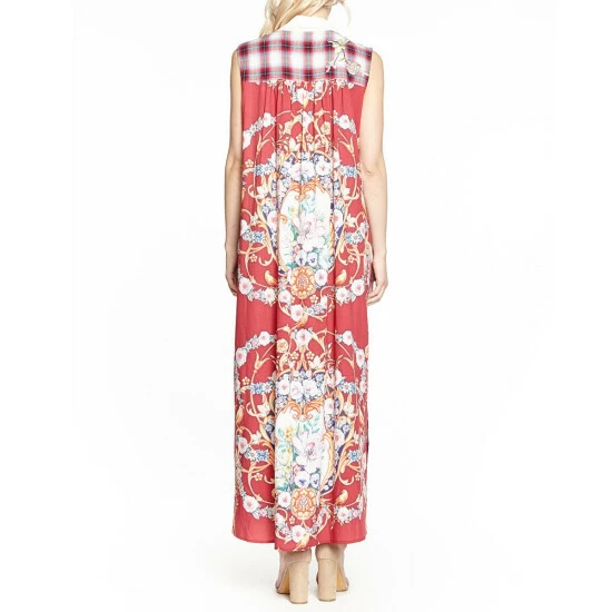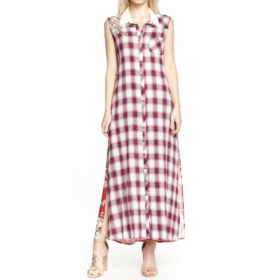 The Colorado’s Court Maxi from Aratta features a plaid front with embroidery detail over the shoulder and all-over floral print back.