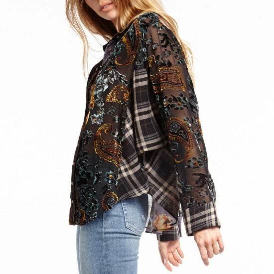 A gorgeous paisley burnout and velvet and plaid combo dolman shirt from Aratta.