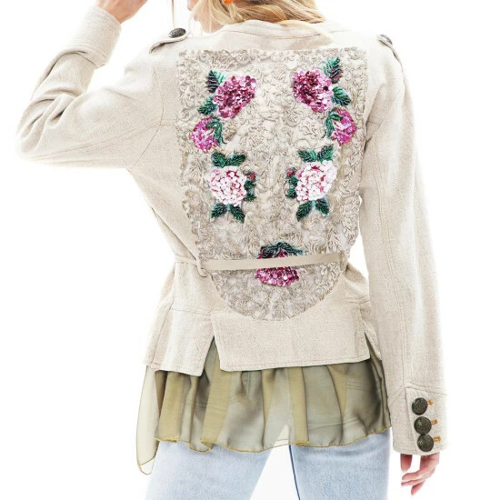 Button up style with this jacket that features prominent button detailing and a stunning embroidered back.