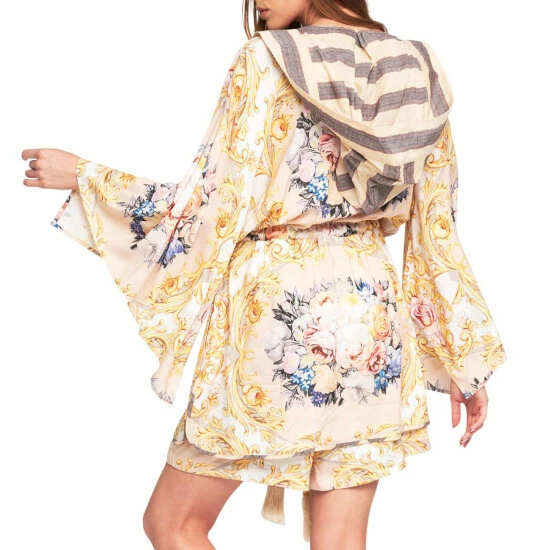The Excitement Wrap from Aratta is a floral print stripe hoodie with front detail and beaded tassels.