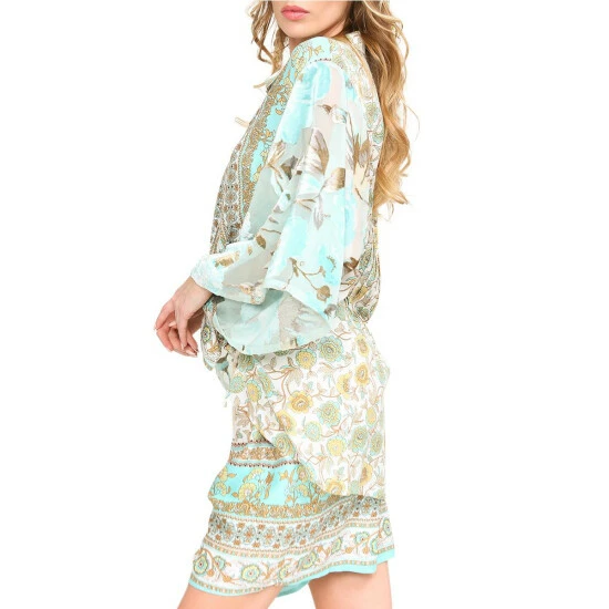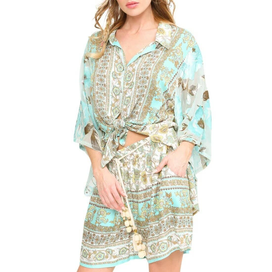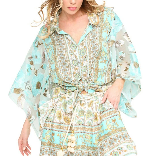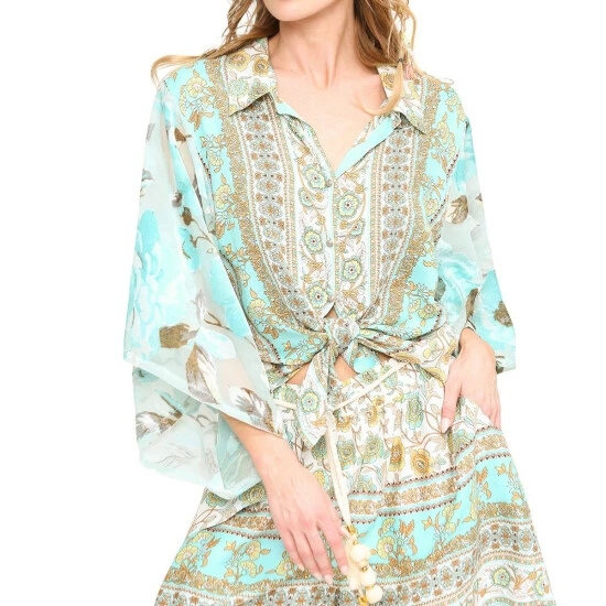 - All-over print self with velvet burnout sleeves, pleated back, tie front