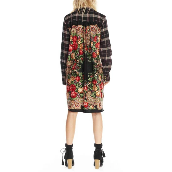 The House of Love Tunic from Aratta is a washed plaid/floral print scarf shirt-dress with royalty patch on the front pocket.