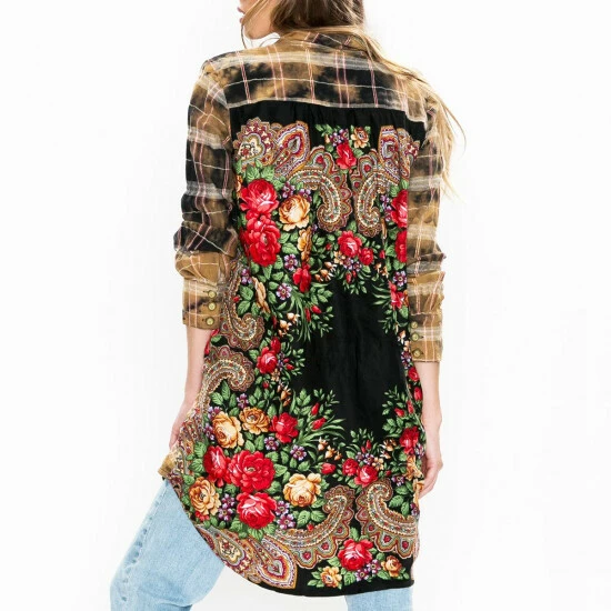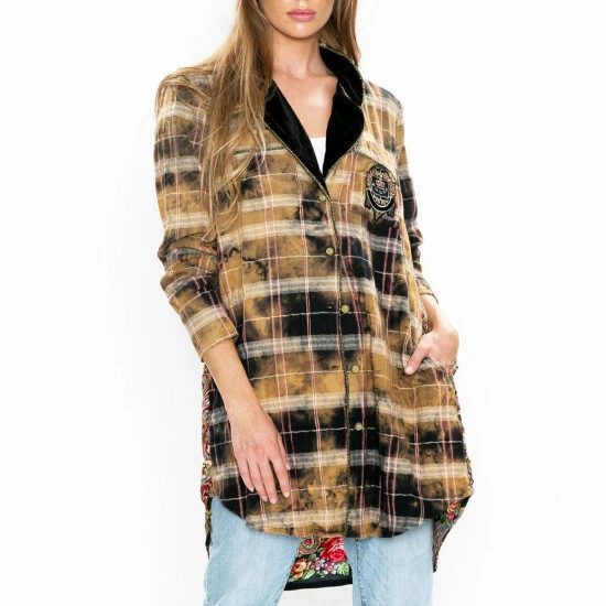 The House of Romanov Tunic from Aratta is a washed plaid/floral print scarf shirt-dress with royalty patch on the front pocket.