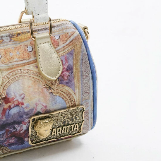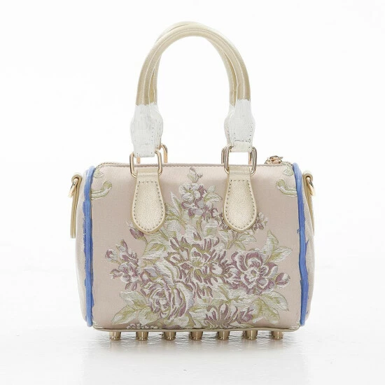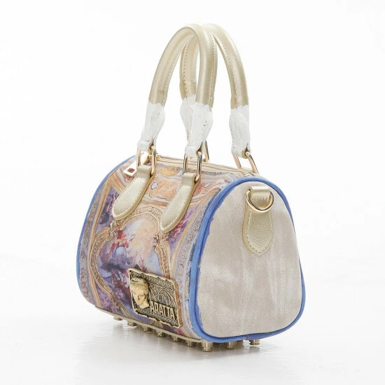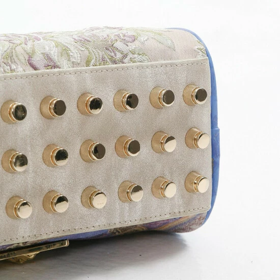 This show-stopping bag features genuine top grain hand-painted vegan leather with art painted canvas and gold touch metal studs.