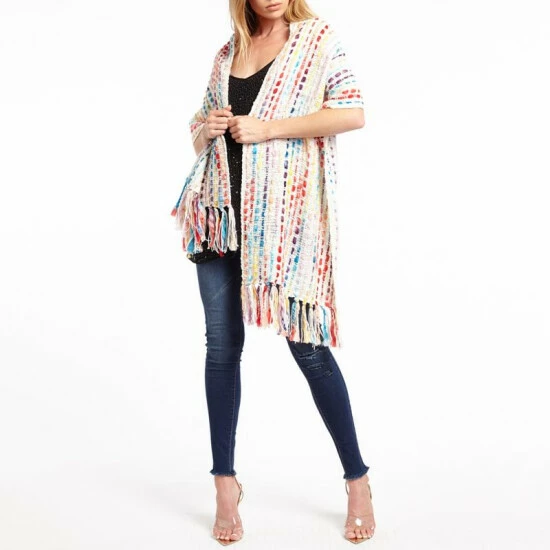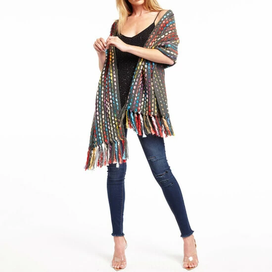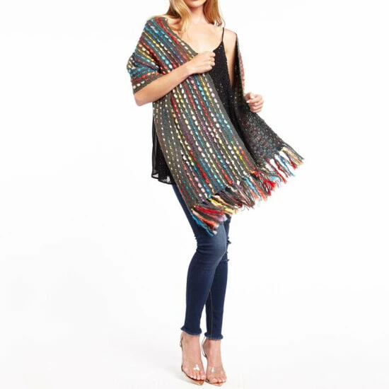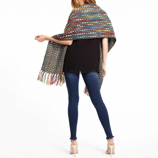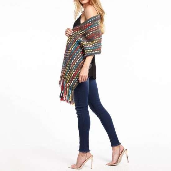 - Multi-colored detailing, fringe edging
