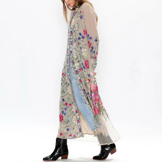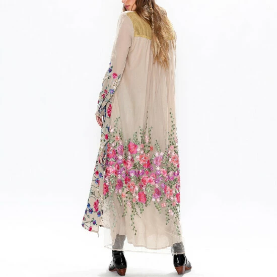 Turn heads in this floral-embroidered maxi duster from Aratta.
