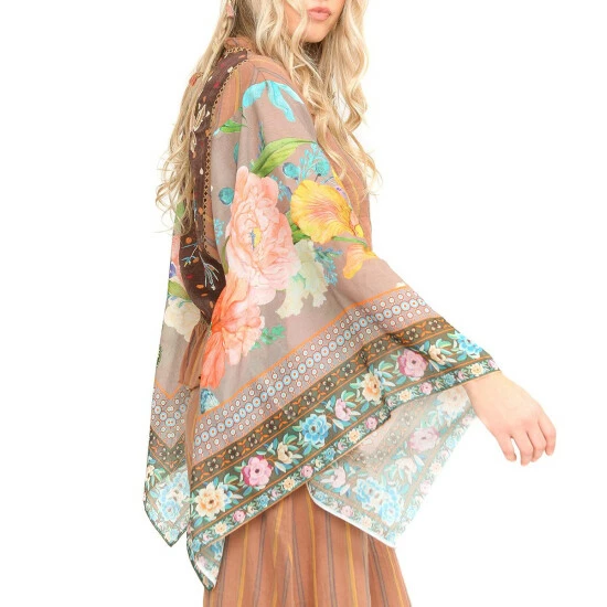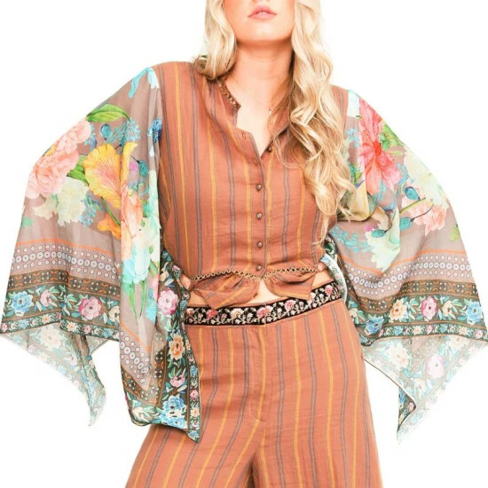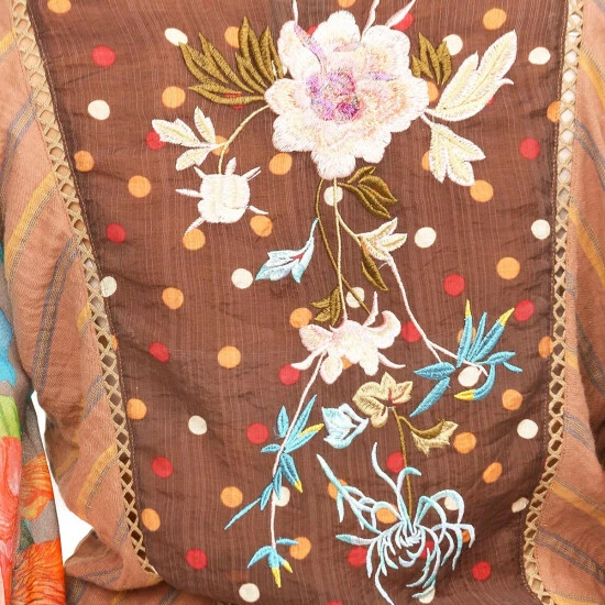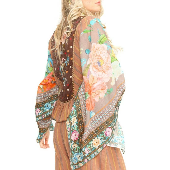 A fun take on a traditional blouse that features contrasting patterns and a unique scarf sleeve.