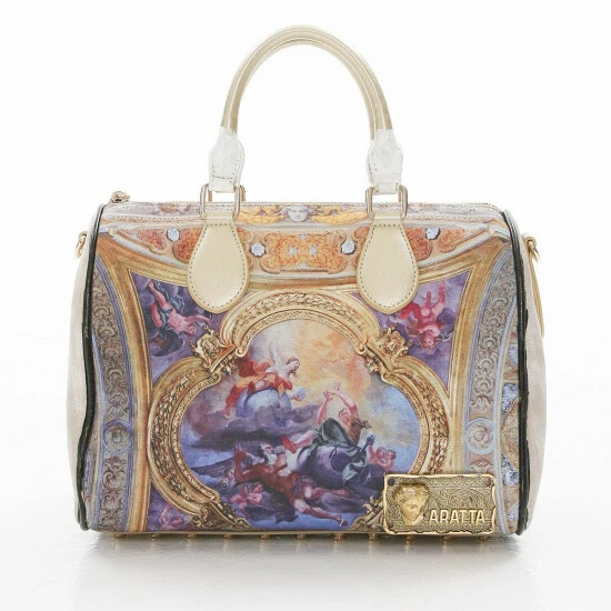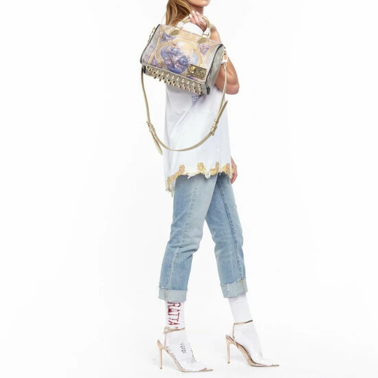 This show-stopping bag features genuine top grain hand-painted vegan leather with art painted canvas and gold touch metal studs.
