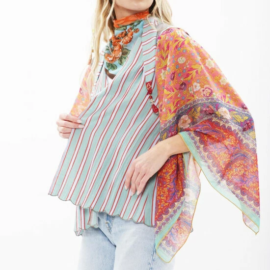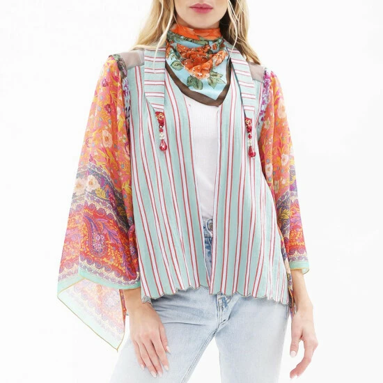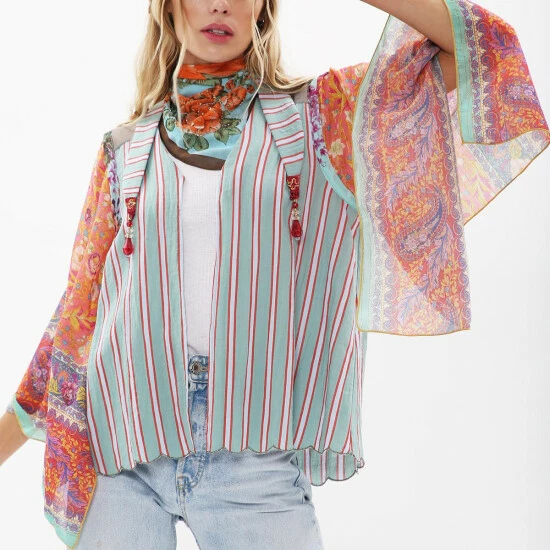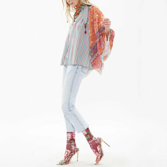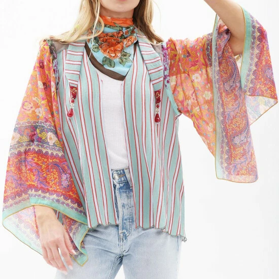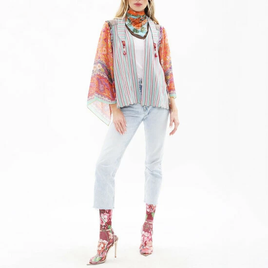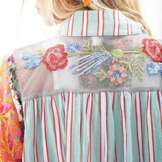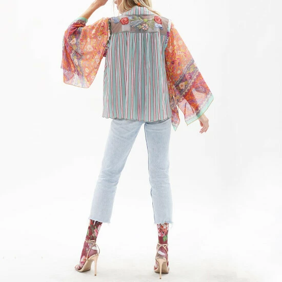 - Embroidered/sequined back yoke, metallic thread scallop hem, floral print flare sleeves, crystals attached to neck tie