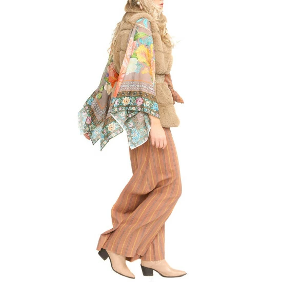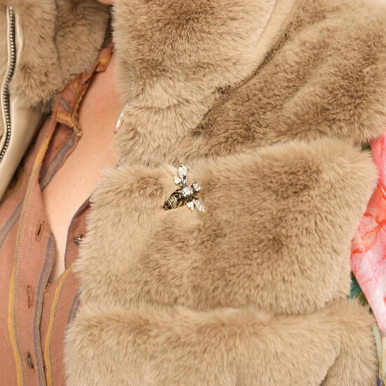 - Faux fur vest, smocked waist, zipper closure, side pockets, removable crystal brooch
