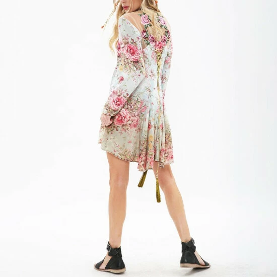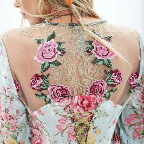 - Tunic dress with deep dye hem detail, beadwork embellished, embroidered mesh back yoke, adjustable lace back