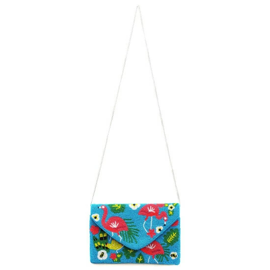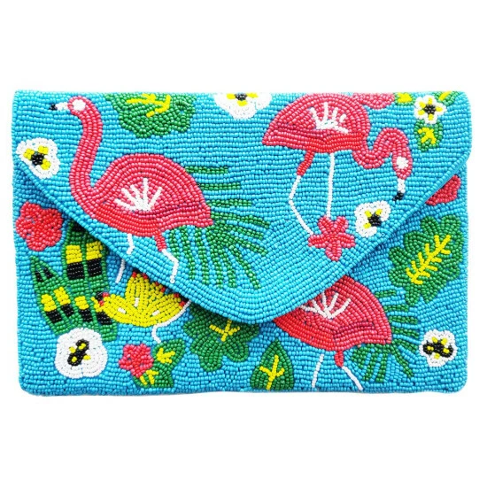 This fun clutch features hand-embellishment with fun flamingos that fit perfectly into paradise.