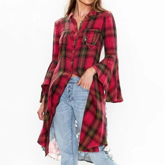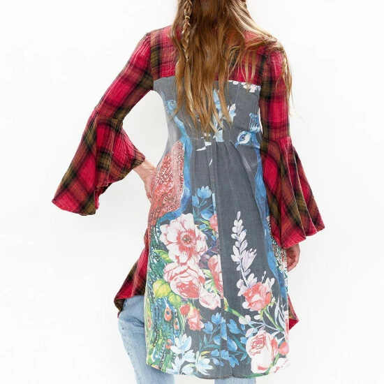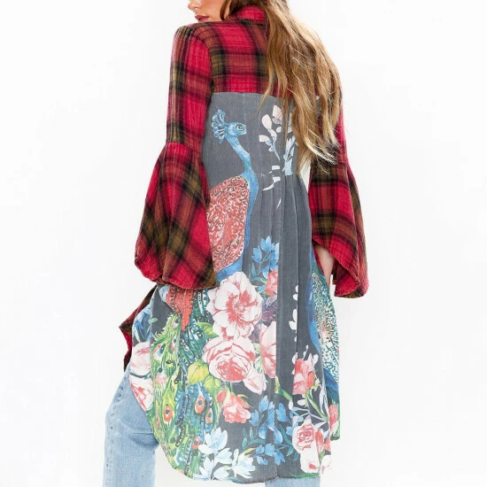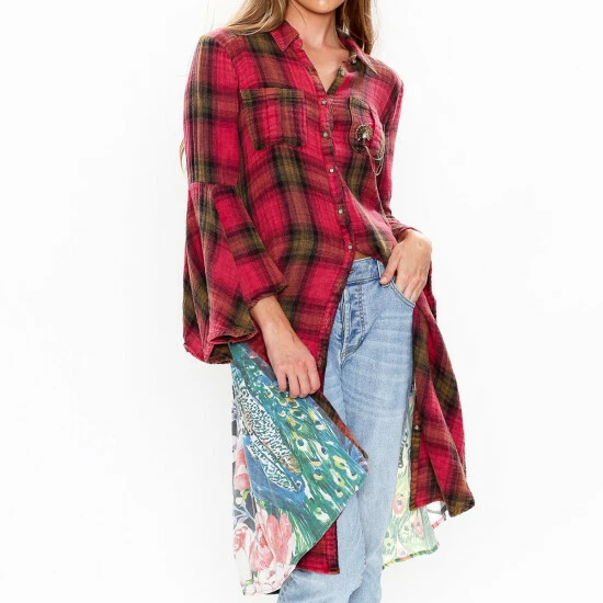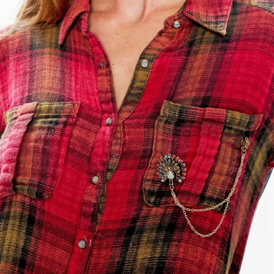 The Peacock serenity shirt dress from Aratta features a wine plaid design with broach in front and picturesque scene design on the back.