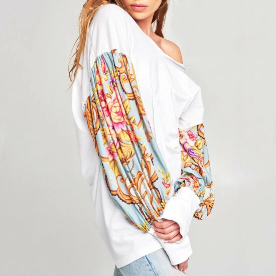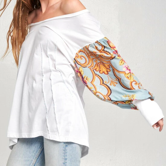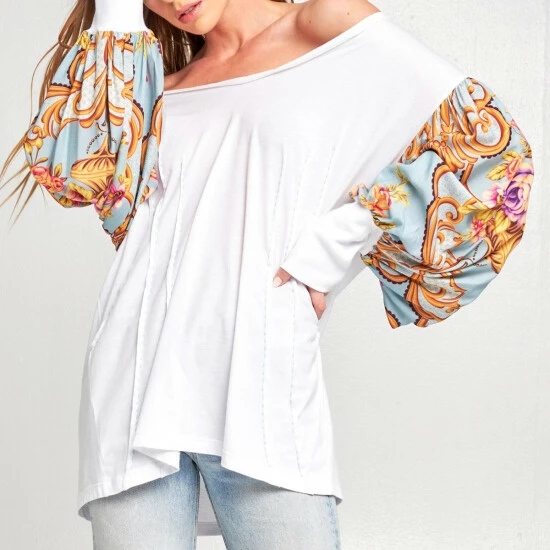 Balloon sleeves with a floral print give this blue ivory top an ultra-feminine flair.