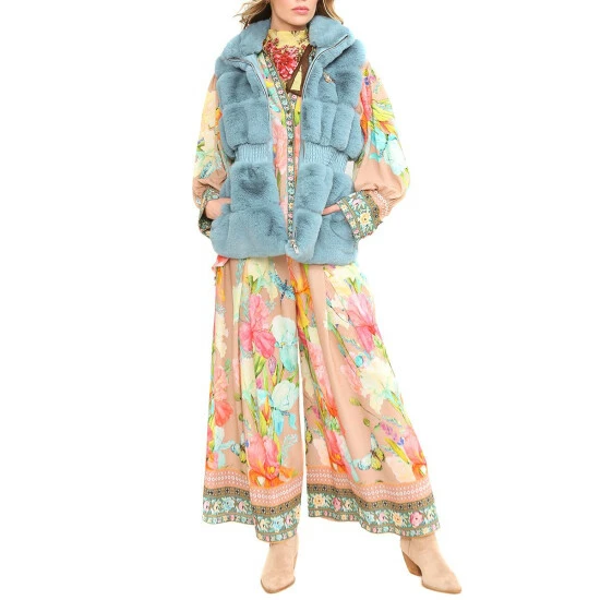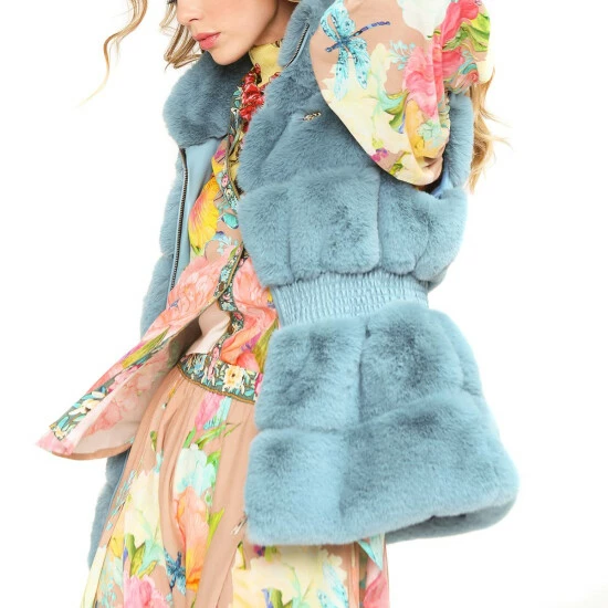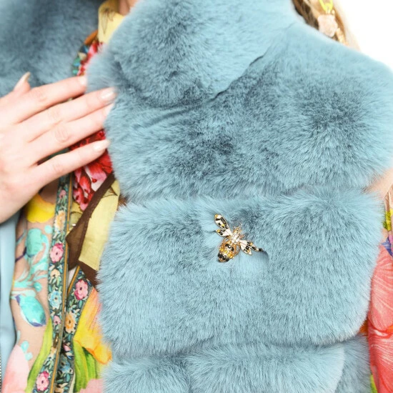- Faux fur vest, smocked waist, zipper closure, side pockets, removable crystal brooch