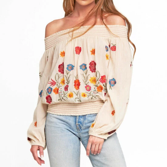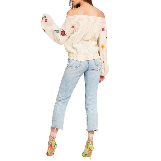 This blouse serves vintage style with its of-the-shoulder necklineand tulip embroidery.